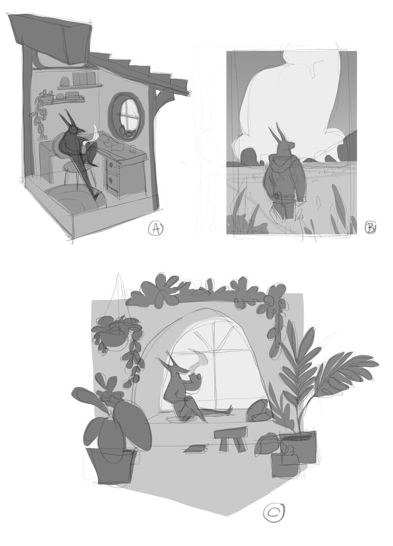 Sketching - Here I refine the thumbnail idea, always trying to push and improve the pose, proportions, shapes, etc.