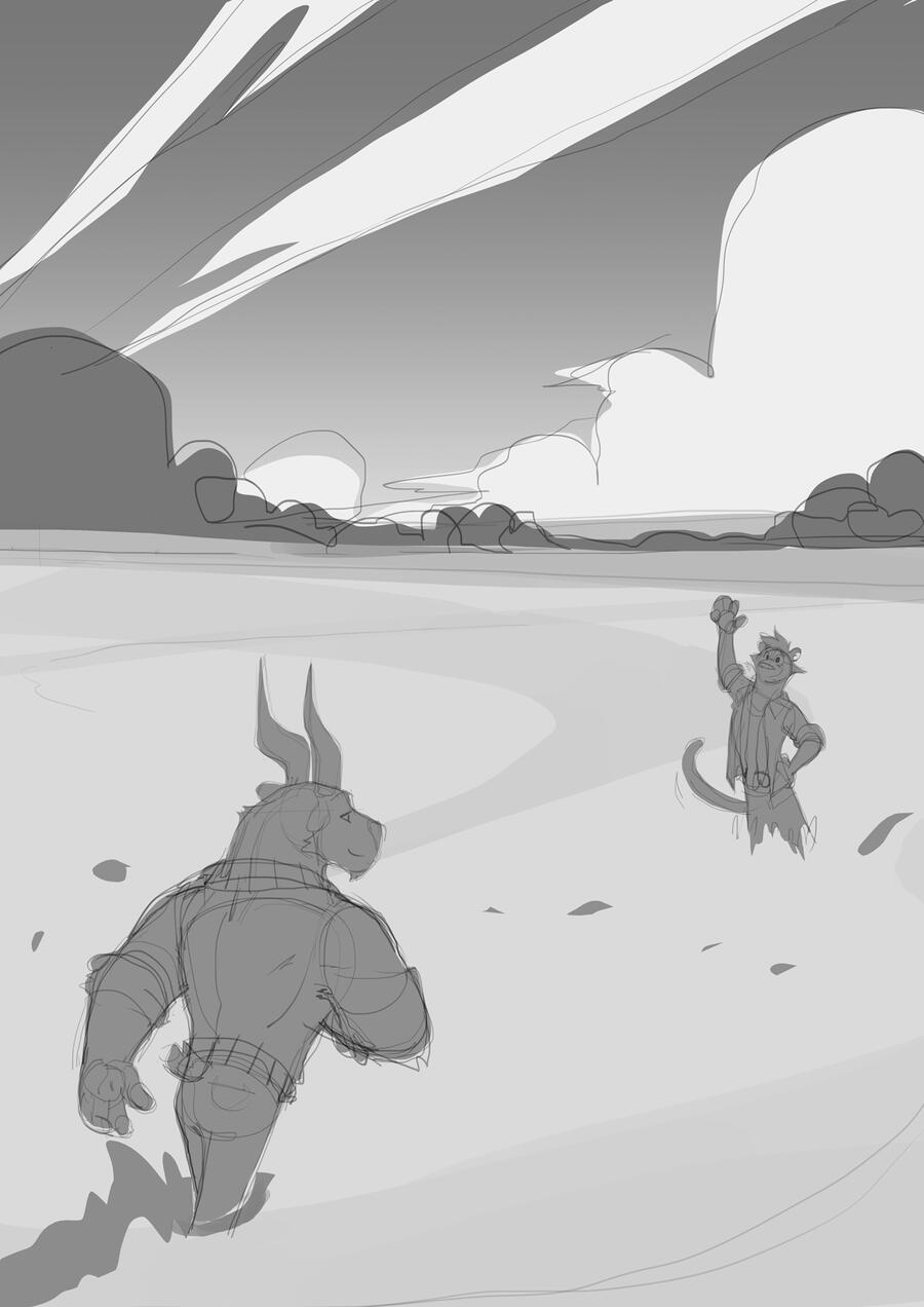 Sketching - Here I refine the thumbnail idea, always trying to push and improve the pose, proportions, shapes, etc.